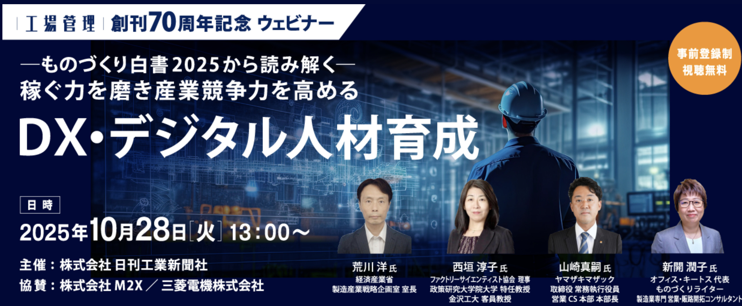 日刊工業新聞社が主催する「工場管理」創刊70周年を記念した特別ウェビナーに、ファクトリーサイエンティスト協会理事の西垣氏が登壇いたします。ヤマザキマザック 取締役常務執行役員 山崎氏 とともに製造業DXの本質に迫ります。