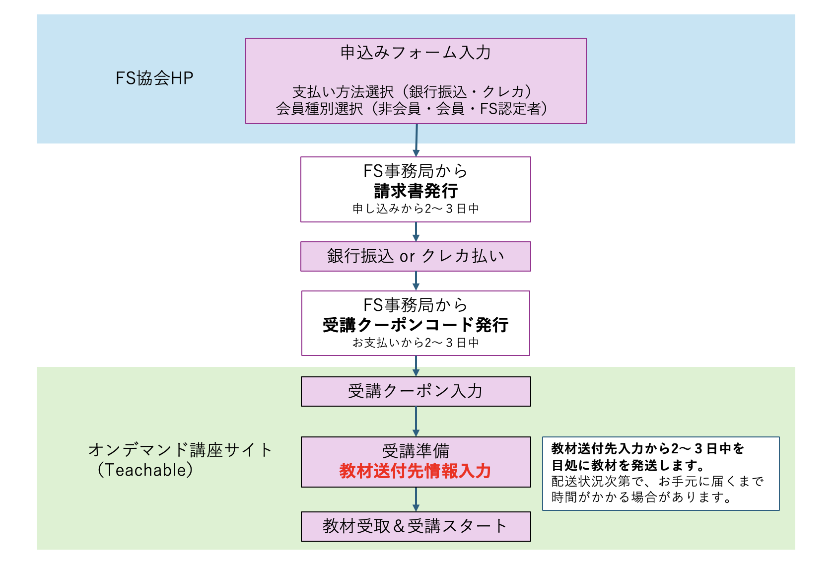 受講準備&配送先入力 | お支払いが完了後、事務局より【受講クーポンコード】を発行します。受講ページにログインして、【受講クーポンコード】を入力後、すぐに教材の発送先情報の入力を行ってください。 |